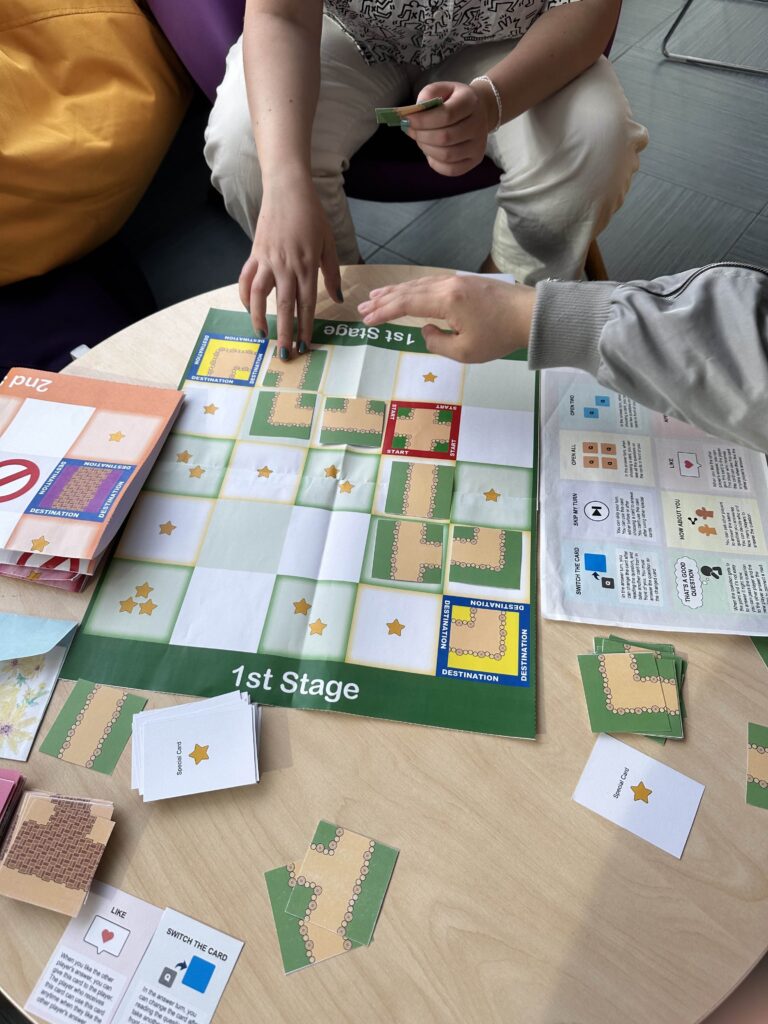 今はボードゲームを作っていて、プレイヤー同士が質問カードを選んで相手に聞き、答えてもらうとカード裏の「道」を繋げていく。全員でひとつの道を作っていくゲーム。